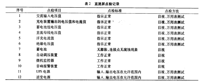 首要需求編制點(diǎn)檢規(guī)范,編制出符合實(shí)際出產(chǎn)需求的點(diǎn)檢規(guī)范,使其他點(diǎn)檢者能快速、簡(jiǎn)潔執(zhí)行點(diǎn)檢規(guī)范。點(diǎn)檢規(guī)范的內(nèi)容觸及方面比較多,列入點(diǎn)檢辦理規(guī)模的部位也比較多,例如直流屏,溝通輸入電壓值、充電裝置輸出的電壓值和電流值、蓄電池組電壓值、直流母線電壓值、浮充電流值、絕緣電壓值、蓄電池、自動(dòng)調(diào)壓裝置、微機(jī)監(jiān)控器、音響報(bào)警裝置、UPS電源、逆變電源等都是關(guān)系到直流屏安全運(yùn)轉(zhuǎn)的重要參數(shù)及裝置,確定為點(diǎn)檢部位。點(diǎn)檢部位確定后,就要落實(shí)點(diǎn)檢內(nèi)容,點(diǎn)檢辦法目前還是以簡(jiǎn)單東西、儀器和人的感觀為主的點(diǎn)檢辦法。因而,點(diǎn)檢內(nèi)容首要是查看設(shè)備溫度、電壓、表計(jì)指示、工作狀況等方面參數(shù)。直流屏設(shè)備點(diǎn)檢工作首要是以日常點(diǎn)檢為主,定時(shí)點(diǎn)檢為輔。日常點(diǎn)檢首要以人的感官為主,經(jīng)過聽、摸、看.擰等辦法對(duì)運(yùn)轉(zhuǎn)中的設(shè)備進(jìn)行一個(gè)外觀的查看。經(jīng)過每日進(jìn)行的點(diǎn)檢工作,及時(shí)發(fā)現(xiàn)設(shè)備存在的危險(xiǎn)并消除,使設(shè)備長(zhǎng)周期安全運(yùn)轉(zhuǎn)。由于直流屏的特殊性,展開的直流屏設(shè)備專業(yè)點(diǎn)檢也很重要,點(diǎn)檢辦法以工用具、外表和人的感觀為主的點(diǎn)檢辦法。經(jīng)過定時(shí)進(jìn)行的點(diǎn)檢工作,及時(shí)發(fā)現(xiàn)設(shè)備存在的危險(xiǎn)并消除,使設(shè)備長(zhǎng)周期安全運(yùn)轉(zhuǎn),見表2。