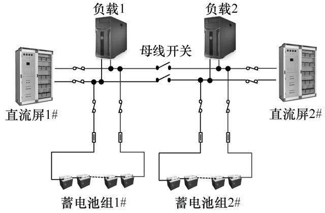 以220kV變電站直流屏系統(tǒng)為例,傳統(tǒng)的配備為直流屏1#接蓄電池組1#,直流屏2#接蓄電池組2#,直流母線之間由開(kāi)關(guān)操控,在呈現(xiàn)異常或保護(hù)進(jìn)程中互為后備電源,其配備如圖1所示。