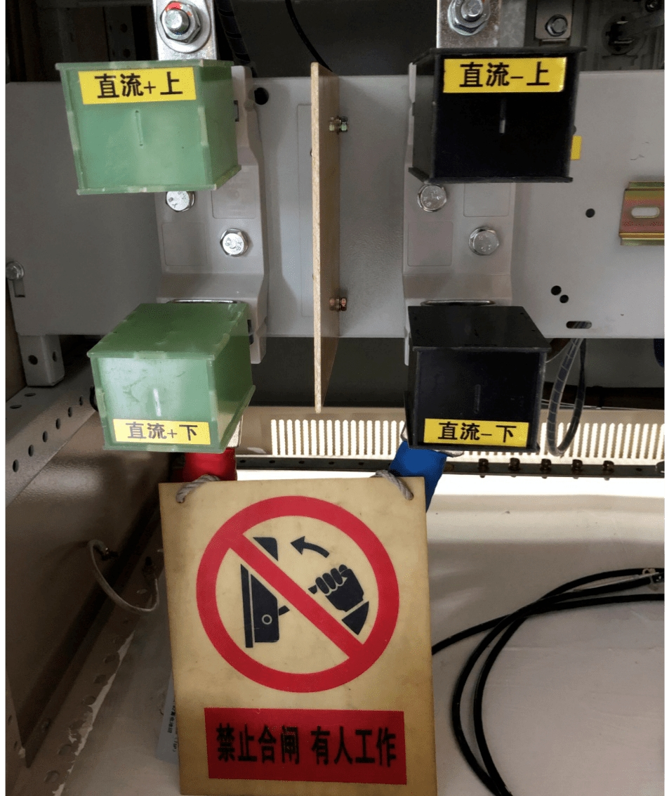 3. 取下蓄電池組保險后,在蓄電池保險的底座正極上下兩端、負極上下兩端別離套上大小適宜的絕緣盒,并在絕緣盒上別離掛“制止合閘,有人作業(yè)!”標示牌。